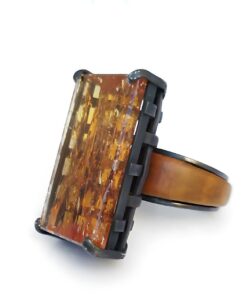 Miriti com seus frutos firmes e luminosos, este anel celebra a resistência e a beleza contidas no tempo. No centro, um topázio imperial lapidado a laser, com cintilações âmbar e douradas, extraído de forma responsável na Mina do Capão e preservado no acervo do ateliê há duas décadas. Um pequeno tesouro brasileiro, guardado como se guarda o segredo de uma nascente.