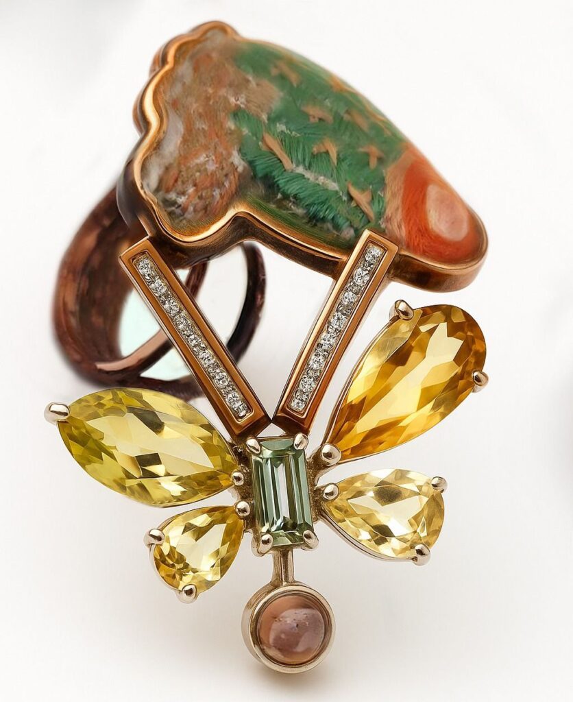 Com quatro décadas de atuação, Adeguimar Arantes construiu uma trajetória marcada por antecipação, consciência e reinvenção. Desde 1985, passou a utilizar metais reciclados em suas criações, muito antes de a sustentabilidade se tornar pauta na joalheria. Adotou o slow jewelry como prática — com produção limitada a cinco peças por ano — reafirmando o valor do tempo, da autoria e da permanência. Foi também a primeira a implementar, entre 2010 e 2014, um modelo de leasing de joias autorais no Brasil, aproximando o público de peças únicas sem a obrigatoriedade da posse. Seu trabalho é gesto artístico e manifesto: delicado, ético e profundamente comprometido com o mundo.